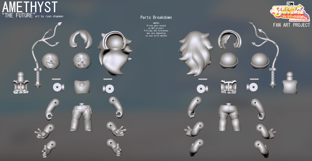 Assemble your own Amethyst action figure by using the files provided to 3D print your figure.